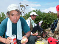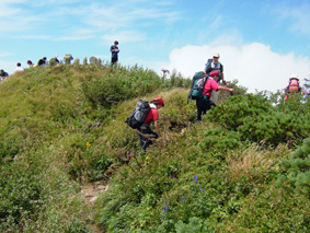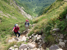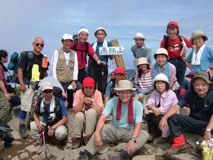 ![]() 荒々しい山容と日本海 ![]() 後方の沢(荒菅沢)&TEKE〜MASA ![]() ![]() ![]() ![]() ![]() 山頂で休憩 ![]() 山頂で記念写真 SEI・Sho・TAKE・HARA・TUKASA・宗形・TAI MASA・SIN・岡部 Joe・石沢・TAN・池上・TAKI ![]() 山頂より笹平 ![]() 下山時 分岐にてSho・TAKE・宗形・Joe 荒菅沢&一輪の花 ![]() ![]() ![]() ![]() ![]() ![]() ![]() 下山後キャンプ場にて大宴会 暗くなっても続くのでした 此処からMASAさんの写真 ↓ ![]() 彼方に見える戸隠山 ![]() ![]() ![]() ![]() ![]() 道中のお花さん Joe幹事の計画でハッカ山苦楽部 8月例会登山に15名が参加 郡山を20日のPM9:00出発 既に合流組のShoさんはキャンプサイトに着きご機嫌に宴会モード 夜中の一時三十分に到着した私達は夜食と共に前夜祭 テントの中は朝方の3:30分まで歓談が続くのでした 眠い目をこすり お早う御座います 5〜6〜7の時間割 幹事のJoeさんと女性の皆さんが 手際よく朝食の準備 参加者は美味しいご飯を頂き予定の時間7に会わせて 登山口に集合 総勢15名が雨飾山へ出発 登山口から少し下り大海川の湿地帯の木道を進む 渓流には岩魚が登山者を気にも止めず 泳ぐ姿 誰かわ解らないが話す??美味しそう晩のおかずに良いね!! 湿地帯を過ぎる いよいよ登りだ滑りやすい道をジグザグに進み ブナの木が目立つ山腹を通過 展望は無いが日射しが森林に遮断され天然の傘をさしてる様だ 下りに差し掛かると荒菅沢に出た 荒菅沢では多くの登山者が休み 沢の空間には雨飾山のピークと布団菱の岸壁が 天に向かい荒々しい表情を醸し出して居た 荒菅沢を渡り尾根に取り付くと急登が始まる 浮き石が多い 滑りやすい道は登山者の行く手に慎重の二文字を植えつける 途中のロープや梯子で渋滞するがこの辺りから展望が開け 私達は遠望の山並みや荒菅沢の一枚岩を心ゆくまで眺めゆっくりと登る 高度を上げ稜線に出ると妙高山や明日登る予定の鉾ヶ岳〜権現岳が目の前に迫る 眼下には日本海が広がり 稜線越しに雨飾山の全貌が飛び込んでくる そのまま進む少し下ると笹平に在る梶山温泉への分岐に出て 展望の良い平地から最後の急登を登ると雨飾山の山頂に着く 山頂は南峰と北峰の二つのピークがあり 私達は北峰の狭い岩場に休憩 冷えたビールに始まりメンバーの持ち寄った食料に舌包みでした 展望は雲に遮られるも白馬大雪渓や戸隠山・妙高山・鉾ヶ岳・権現岳 等を確認出来た 一時間の休憩後 下山 雷の音に急かされるように下りました 下山後 露天風呂や旅館の温泉と二手に分かれ入浴 早い時間から宴会に突入 一泊組の4名も何故か(^-^)帰らず 明日の朝までご一緒にと和気藹々に過ごす 飲めや(歌い・・・酒よを大合唱 (^O^)・・・) 隣のテント組のキャンプフアイヤーに負けじと盛り上がりました 朝帰りのTANさん SINさん 岡部さん 池上さん おつき合いありがとうございました 権現岳組の皆さん 二日目の登山にトライ・・(@_@) 頑張りましょう 22日に続く・・・・SEI・・・ 戻 る |