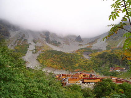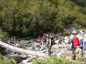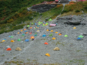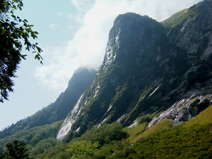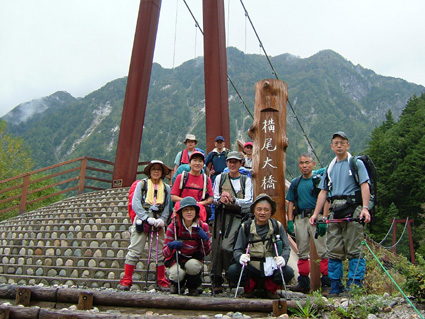 ![]() 上高地ターミナルにて 河童橋 HARA・AN・HAYA・Sho・TAN・OHG・MASA TAKI〜ojyou〜Miho 雨の中 予定時間に出発する事が出来た 二時間ほどで雨も上がり雨具とおさらばでき軽快に歩くことが可能になる 梓川沿いを 明神〜徳沢〜横尾と進む ![]() 横尾大橋 TAN・AN・MASA HAYA・Ojyou・Sho・HARA・OHG MIHO・TAKI ![]() 屏風岩 横尾から本谷橋に進むと左に屏風岩の圧倒される岩峰が現れる 左左と巻くように進む 朝の雨の洗礼を受けた木々や草は瑞々しく大地の生命を感じる!! 倒木や岩の姿に目をやれば其処にはキノコの列が 背伸びした草を分け覗き込むとシメジやオリミキの固まり 美味しそうと逸る気持ちを抑え 登山道を進むSEIでした。 本谷橋 涸沢のテント場 本谷橋の下を流れる清流に 疲れを癒す登山者の姿が多く見られ 横尾から涸沢小屋までの中間地点に位置する場所はオアシスの様な光景で在る 涸沢に到着!! 色とりどりの傘を開いた町並みの一角を思わせる風景 大都心の流れがそのまま移動したのかと錯覚さい憶える ![]() ザイテングラードより北尾根 ![]() 左奥に常念岳〜右の端に蝶ヶ岳 朝の雨は上がったが垂れ込めたガスが遠望を遮る 辛うじて常念岳や蝶ヶ岳の姿を確認 振り返り穂高岳を見上げるが 穂高山荘の姿を確認出来るに止まる悪戯なガスに 登りきる頃にはサヨナラしてねと祈るように目的地に向かう仲間の姿が・・・・ ![]() 前穂高岳 & 涸沢 涸沢岳山頂にて Miho・AN・SEI・Ojyou 前穂高岳の姿を稜線越しに見つめ穂高山荘に着いた 流れるガスに覆われ 見渡す目先に映るのは輪郭のない山肌と登山道 足元を見つめOjyou・AN・Miho・SEIが涸沢岳の頂上に登りきるのに時間はさほど必要では無かった。 次のページへ |