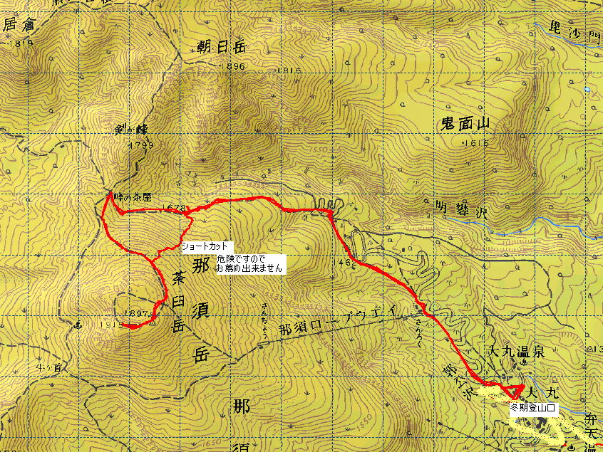 登り 大丸温泉AM8:10 〜 峰の茶屋 AM10:50 〜 休憩一時間(11:50迄) 〜 山頂 12:50 〜 小休憩 〜 下山 山頂PM 1:00 〜 沢下り 〜 峠の茶屋 〜 大丸温泉 PM 3:00