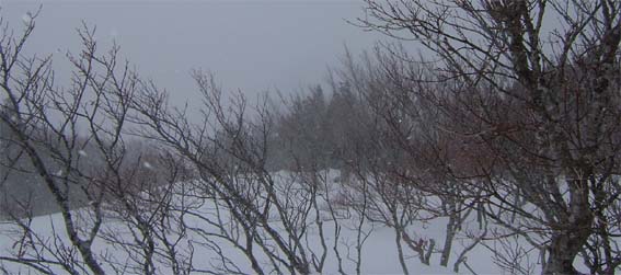 ただ灌木の木立が行く手を阻む 降りしきる雪で視界が悪くコンパス頼りの進行方向