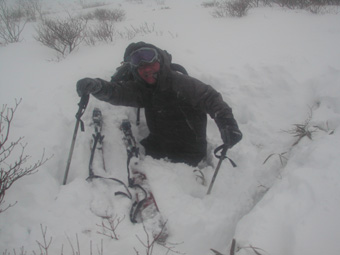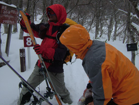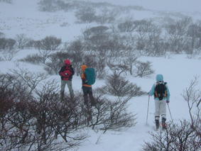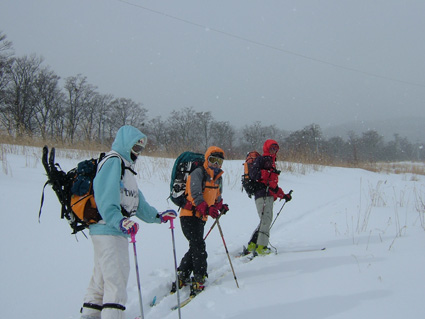 ![]() 閉鎖中のゲレンデを登る 荒れたゲレンデ(山スキーの入門コースに最適) 気持ちよく登れました ![]() 新雪はキラキラと光!!ふらふらと舞えおりる雪 ゲレンデピークの登山口(Masa・ojyou・Hirorin) ![]() ブナ林の山腹(1500m付近) シールワックスを塗るMasa ![]() スキーを外すと腰まで・・・・(>_<) ← MASAさんの滑り(^-^) ← ojyouさんで〜す(^^) ← Hirorinで〜す ![]() ![]() ↑ GPSで軌道修正 中腹でランチタイム(この後 降りしきる雪で撤退) 郡山をAM7:00に出て赤面山にはAM9:35に到着 準備を整えAM9:50登りはじめる 登り初めからの雪 閉鎖されたスキー場は銀世界へと私達を招く 粉雪が舞う赤面山へ ゲレンデピークに登山口の案内板が顔を出していた 此処からはブナ林 雪化粧の大地にブナ林!!飾り気のない自然を風靡し爽やかな心に成れる瞬間でも在る 山頂手前50m地点は笹原に新雪が被さる程度の積雪 スキーを外すと 腰まで潜る 安全登山を考慮し此処から下山開始する 粉雪の積もる山腹をスキーが走る Masaさん ojyouさん Hirorinさんが気持ちよさそう 荒れたゲレンデは山スキーに最適 雪煙を上げて滑降する様は雪に舞う妖精(チョット誉めすぎ)の様だ!! ゲレンデ中腹でランチタイム の は ず が・・・・降りしきる雪で遭えなく撤退致しました 下山後 大丸温泉に泊まり宴会&温泉で極楽の1日を閉じる MasaさんojyouさんHirorinさん有難うございました ・・・・SEI・・・・ |