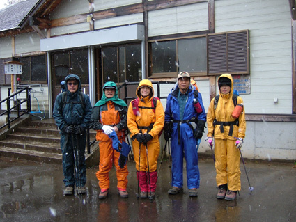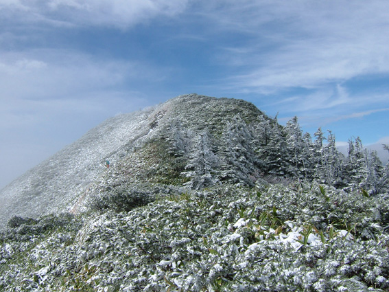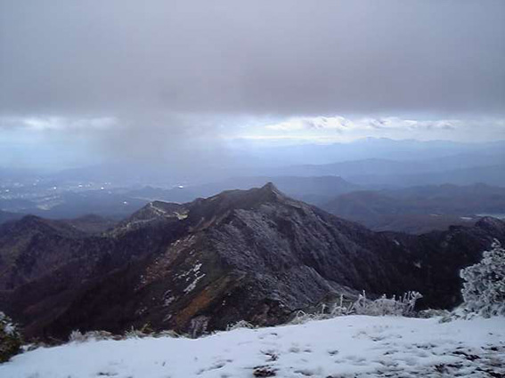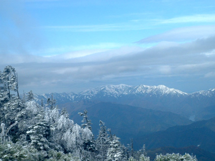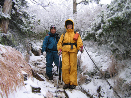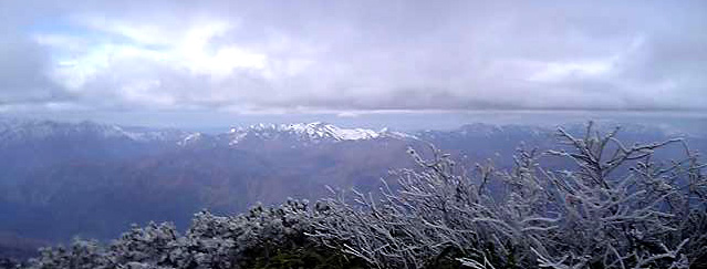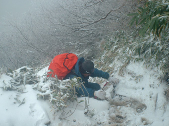 ![]() 麓の紅葉 ![]() 雪の降る登山口(SUMIさん TAKIさん Mihorin TETUさん ごんぞうさん) ![]() 遊歩道を登る 次第に雪化粧になる白樺林 ![]() もみじの赤に化粧を!! 遊歩道も終わり登山口が現れる ![]() ロケの標識 ↓ 案内 ナナカマドの赤い実が引き立つ初冬 ![]() ロケの内容 道標 避難小屋にて ![]() クサリ場 滑る急斜面 稜線に出る ![]() 三ツ池の一つ 稜線より越後の峰 ![]() 武尊山 ![]() ![]() 山頂 ごんぞうさん TETUさん TAKIさん SEI SUMIさん Mihorin ![]() 獅子ヶ鼻山 ![]() 遠望に谷川岳 ![]() 樹氷 クサリ場を下る ![]() 初冠雪の武尊路 一ヶ月ぶりの登山になりました 22日午後に郡山を出発した 東北道を上り群馬県片品村へ向かう 雨が車の窓にぶつかる音が大きく聞こえる 週末に成ると天気が悪くなるパターンが続いてる様に思いた スムーズに走る車窓からは紅葉した木々が雨に打たれて鮮やかに映える 赤が綺麗だ!黄色が輝く!色つき始めた葉が可愛い麓も間もなく向かえる錦秋の足音が聞こえてくる。 日光いろは坂にさしかかると渋滞に巻き込まれる 動かない車、ただ車窓から見える紅葉がいらだちを緩和してくれる 中禅寺湖の周辺は渋滞で車が溢れてる 駐車場に入れない車や行き交う車が鉢合わせ状態で進まない 中禅寺湖の紅葉は盛りの様だ、遠望の山並みも鮮やかに染まる思わず大きな声 (ウワー綺麗だー 凄いなー 赤い実が 落ち葉が 草紅葉がと見渡す限りの黄金色に感激するメンバー) 戦場ヶ原を過ぎて金精トンネルを越すと菅沼〜丸沼〜大尻沼と右手に見える 間もなく片品村に到着だ 日光白根山の裾のを通り本日の宿に着いたのはPM5時周りは暗くなり始めていた 宿では前夜祭の酒盛りで乾杯〜 持ち寄った料理や飲み物がコタツの上に並べられた 美味しい料理の数々、ごちそうさまでした・・・・・(~o~) 夜中に雷の轟音が宿の窓を振るわせる、光が走る・・・が・・・皆さんは寝耳に水の爆睡 (笑) 翌日6時に宿を出る、登山口に6時30分到着の予定が道を間違えたSEI 一時間のロスタイム、東俣登山口に着いたのは7時30分になり登り始めは7時50分、ご免なさい皆さんm(_ _)m 駐車場周辺の木々は見事な紅葉で染まる 特にナナカマドの実が赤く輝き降り積もる雪とのコントラストがマッチして素晴らしい 登山道を登り始める頃になると雪が多くなり道に添えられたモミジの葉に重なる雪が一段と赤を強調させた 遊歩道の分岐に着く、ここからは白樺の林に囲まれた見事な道が続く、初冠雪のプレゼントを頂き 一度に二度楽しめた武尊山登山 晩秋の山と初雪の白が重なり 山頂へのパノラマを感動する時間と夢に変えてくれました。 ぬかるみの登山道は何処までも続く、足首まで潜る道に足を取られて転ぶメンバーの姿が!! それでも歓声は続く、ガスに包まれた山肌の奥に見えない景色!! 足元には白い妖精が降り立つ クサリ場を見上げれば寒さで凍り付くロープが此から登る私達を待っててくれました。 山頂が近づくにつれて樹氷の輝きが増す、時々太陽の明かりが稜線を照らす うっすらと現れる峰に視線が釘付けになりカメラを取り出す動作がもどかしい、瞬時で消える大空間の峰が幻のように脳裏に残る 残らないカメラ画像が恨めしい 山頂まで後20分の位置に着く 今までガスに覆われた山々がスクリーンに映し出されたように現れた 太陽が顔を出す 遠望の山が見えた 切れ落ちた谷の空間が紅葉した様や雪化粧の山肌が!! 凄い待ちかまえたような時間と360度の空間が私達の目の前にある 富士山〜谷川岳〜至仏山〜越後の山々〜等々と素晴らしい景色が飛び込んで来ました 山頂には数人の登山者が休憩しています 食事をしてる人やカメラアングルに夢中になる人と様々な動き 私達も記念写真を撮り休憩 私は今回の登山にもう一つの願い事がありました それは今月の3日に旅立った母の山頂供養であります(母は山歩きが大好きでした) 母の分身と共に登って来た私は、仲間にお香を焚いていただき母の好きな饅頭とお酒と煙草を供えて 供養をさせて頂きました。 皆さん有り難うございました・・・・・・m(_ _)m 山頂滞在は20分ぐらいで下山する(風が強く寒いため) 足早に下るメンバーが時々立ち止まる!太陽に照らされた樹氷の輝きに心を奪われて静止 放射線状に反射する光線が山肌を眩しくする 綺麗だね〜とSUMIさんがしみじみと語りかけた 避難小屋で遅い昼食 外で食事の私達の上に樅の木?から滴が落ちる 衿から冷たい滴が入る みそ汁には飛んできた小さな実が泳ぐ、ビールと共に胃袋に入る気にもせずに!! 初雪の武尊山とも間もなくお別れだ どろんこの道に足をすくわれながら無事に登山口に着いたのは 午後の4時20分 薄暗くなってくる時間帯に成る 登山口の小屋で汚れた靴と雨具の泥を落とし 帰路の道で温泉に浸かり蕎麦を食べ生ビールで仕上げる・・あ〜極楽極楽 ご同行の皆さん有り難うございました 母の供養を頂き感謝致します ・・・・SEI・・・・ 戻 る |