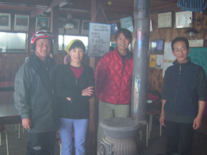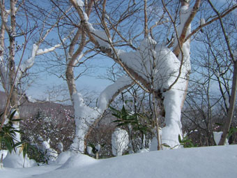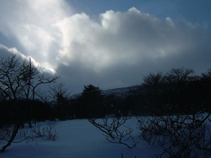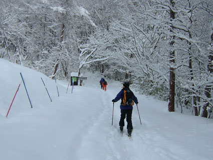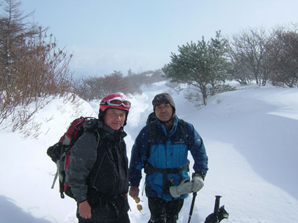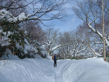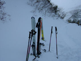 ![]() 安達太良スキー場よりシールを付けて出発(ごんぞうさん) 道 標 ![]() 新雪を踏みしめ登る 新しい?道標 ![]() 登山道は踏み固められてる 岳樺の体操(ん〜見えないかな!) ![]() 途中で会ったHさん(右の方で〜す) 勢至平の分岐 ![]() ナナカマドの実が木々を彩る ようやく見えた(くろがね小屋) ![]() くろがね小屋にて(Mさん ・ ごんぞうさん ・ 管理人の佐藤さん ・ ご免なさい名前?) ヘルメットのSEI ![]() 小屋越しに鉄山の方向を眺める 下山前にハイポーズ(ごんぞうさん) ![]() 小屋の手前にスキーをデポ 勢至平より中央に篭山 ![]() 奥に安達太良山の稜線が微かに見える 白い大地にカラマツ林が整列 今シーズン初めて山スキーにて安達太良山に来ました 天気予報は曇り ゴンドラが動いてれば山頂に向けてラッセルの予定でしたがゴンドラは運休 勢至平経由でくろがね小屋までにルートを変更して出発する。 新雪は50〜60cmくらいでトレースを外れるとラッセルがきつい これでは山頂方面はかなり手こずるだろう! ゴンドラが動いていたとしても山頂へのコースは半分も進めないだろうと推測できた くろがね小屋までの登山者が多いのか踏み跡は大きくVの字に口をあけて道が出来ている 木々には昨日からの雪が枝に積もり重そうにしだれる・・・・重くもないか? ウエアーの胸元を汗を発散させるために大きく開けてる ごんぞうさん とSEIに風が悪さをする ヒューと音をたてて木々を揺する 大きな丸い雪の固まりが落ちてくる くびったまから雪が入る ウヘーつめてー 容赦ない攻撃 面白〜いと訳の解らない身振り 子供が雪遊びをしてる様だ 風と雪と登山道に優しく歓迎される 白い妖精の季節!! 1250m地点を過ぎると平坦な歩きに変わる 遠望は霞見えない時折吹く強風に雪が舞いあがる 忍者が隠れ技を出したのかと思うように前方を行く ごんぞうさんが雪面より消えた 勢至平の分岐手前でHさんに声をかけられる いつもHPを見ていますδΔθωζちんぷんかんのSEI お話をすると游山のメンバーSUMIさんの知り合いで在ることが判明(ここで使う言葉かな!!ん〜ごめんちゃい)致しましたm(_ _)mです くねるコースを進むと荒竜岩の下方にくろがね小屋が姿を現した。 前方の鉄山の谷は白く視界が閉ざされて何も見えない 足元の不安定な雪面を下り小屋に入る 小屋の引き戸を開けて入ると懐かしい(少し大げさ2年ぶり)空間が飛び込む 途中で先行したMさんや管理人の笑顔が!温かい雰囲気が漂うくろがね小屋に疲れが吹っ飛ぶのでした。 小屋ではいつもの山談義に終始 想い出話や小屋でカップル誕生話で盛り上がりました。 満腹のお腹になり下山前には檜の浴槽で温泉に浸かる 湯加減最高 雪景色最高の窓辺にふわふわと舞う雪・・・ 午後の日差しが雲間から覗く景色に促されてくろがね小屋を後にしました。 緩斜面を気持ちよく滑り下ると遠望には阿武隈山系の山々が白く峰を連ねて落ち日に輝き!! 今日のドラマの集結を宣言したかのようでした 今日 出会えた皆さんに感謝いたします ごんぞうさんお疲れさまでした ・・・SEI・・・ 戻 る |