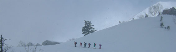 ![]() 緩斜面の雪原を行く しばらくぶりのShoさん ![]() ダケカンバ 山の神 稜線にて休憩 ![]() 栂池公園を眼下に(雲の中は白馬岳) 山の神尾根 ![]() 天狗原組と連絡をとるSEI ![]() Ojyou〜Sho〜AN 乗鞍の斜面(シュプールが!!) ![]() 天狗原 天狗原の祠(Sho〜AN〜Ojyou〜MASA) ![]() 大斜面を滑るスキーヤー ![]() 成城大学小屋前にて昼食 元気なご年輩のスノーシューツアー 12日は山スキー 栂池公園〜天狗原までの予定 天候は良くない 小雪舞う1日に成りそうだ!! リフトを乗り継ぎ終点まで行くゲレンデを横切りコースの取り付きへ その時・・滑降禁止区域のロープを無視して滑ってきたボーダーがMASAさんへ激突 もんどり打って飛ばされた 大丈夫かとメンバーが気遣うがボーダーはそのまま立ち去って行く!! ”唖然とする私達を横目に常識はずれのボーダーは居ない” MASAさんは大丈夫と登りはじめた トレースが雪面に多く踏み固められたコースは歩きやすい 風も無く汗ばむ位だ 栂池山荘を見下ろし時折吹く強風に震いながら美味しいビールを頂きました 天狗原を目指して登るメンバーは11:50分頃まもなく着きますと電話にて確認できた 天狗原は風が強く15分ぐらいの休憩で下山〜成城大学小屋前にて昼食を取る 大休憩後 ANさんの提案にて沢下りをする(Sho・AN・Ojyou・MASA)さんの順番にて滑降 ※ GPS軌道にて沢を紹介して在ります) 素晴らしい沢をANさんが教えてくれたとメンバーが感激Shoさんは再挑戦をすると誓う!! 早めの下山の私達は天狗原組を迎えたのは御宿でした お疲れさまでした 二日目も感激の栂池スキーツアーと成り有難うございました ボーダーの皆さん お互いに怪我をしないように楽しみましょうね・・宜しく (^_-) 明日は最終日 早く寝て八方尾根の展望とゲレンデを楽しみましょう MASAさんShoさんANさんOjyouさんMihorinさんHirorinさん 宜しくね・・・SEI 戻 る |