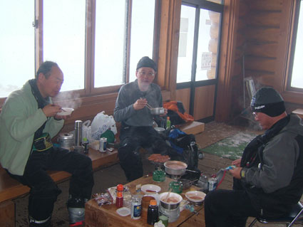 ぼんやりと霞む中 小屋が現れる さー昼飯だと、なだれこむメンバー
