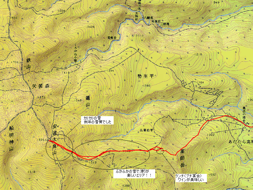 今回のコース(GPS) 戻 る 登り 薬師岳 AM9:20 〜 分岐 AM10:00 〜 山頂 AM11:00 〜 下り 山頂 11:15 〜 薬師岳 12:30 〜 休憩(13:30) 〜 ゲレンデ13:50