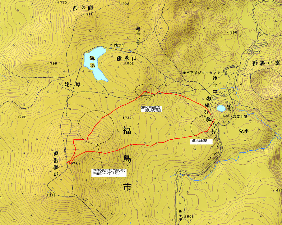 今回のコース (GPS軌道) 戻 る 登り 兔平駐車場 AM 8:10 〜 1650m(8:40) 〜 山頂 AM 11:00(1974.7m) 〜 休憩(30分 〜 滑降 下り 山頂 AM 11:30 〜 1750m (12:05) 〜 兔平駐車場 12:40