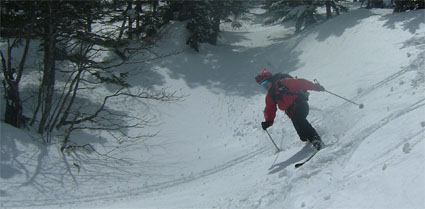 たけさんの案内で目的のコースに辿り着く 少し開けた急斜面、美味しそうな斜面にSEIが