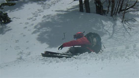途中の黒い帯状の雪面 急ブレーキがかかり頭から大回転 数回の回転の後