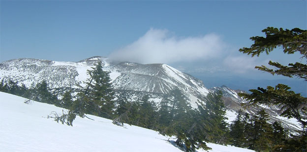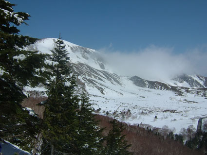 左に前大巓〜右奥に一切経山 東吾妻山(一年を通して黒く見える山)