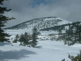 山頂の木々にはエビの尻尾が見られる 道標と雪のない山頂