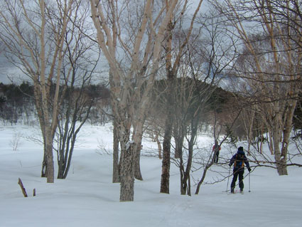 休憩を終えた私たちは滑降開始 案の定、重い雪に難儀し林間を下り