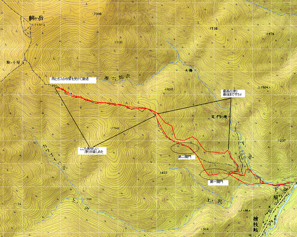 登り AM6:10出発 〜 ブロック雪崩(第一関門)AM6:50 〜 夏道合流地点AM8:15〜折り返し地点(1980m)AM11:15 下り AM11:30 〜 谷筋へ 〜 堰堤 〜 林道 〜 登山口 PM12;48