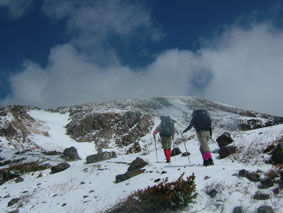 一切経山の稜線に出ると足下が悪く所々足首まで抜かる、スパッツが悲鳴を上げた
