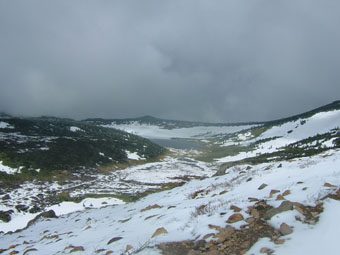 鎌沼への下りは雪渓歩きテンポ良く高度を下げた 酸ヶ平避難小屋の沢に取り付き