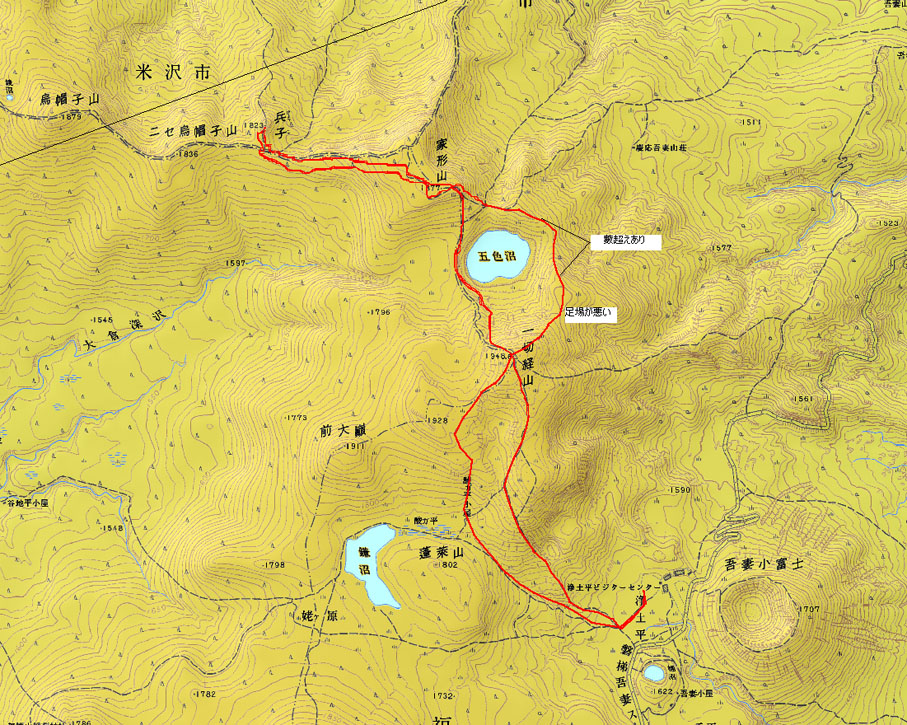 浄土平駐車場 AM 8:30 〜 一切経山 AM9:50 〜 家形山 AM10:50 〜 兵子12:00 (休憩) 兵子12:50 〜 家形山 13:45 〜 一切経山 15:15 〜 駐車場 16:00