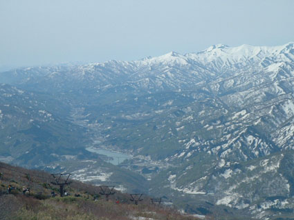 リフト乗り場までの道のりは長〜い 月山湖 & 後方に大朝日岳と連山