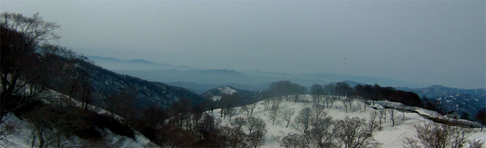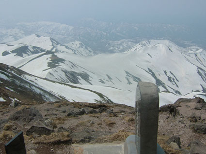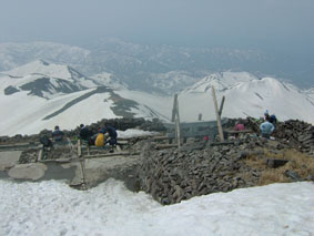 頂上小屋は雪の下(奥に月山神社) 山頂より(左奥は湯殿山〜右に品倉尾根)