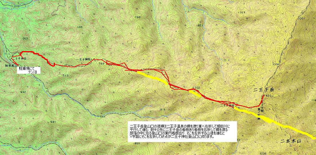 登り 二王子神社登山口 AM 7:40 〜 1200m地点 AM 10:35 〜 山頂 AM 11:30 (1時間30分休憩) 下山 山頂 PM1:00 〜 登山口へ PM 3:30