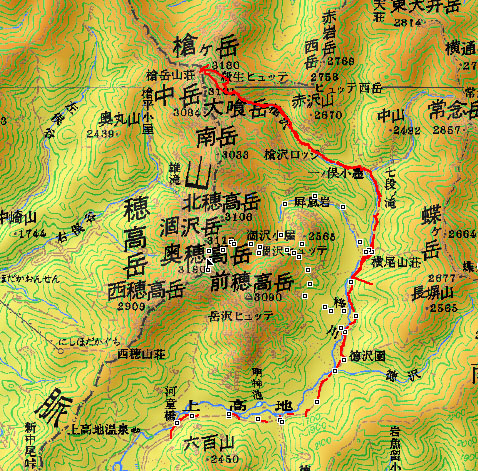 23日 上高地 AM8:45〜明神 AM9:50〜徳沢 AM11:30〜横尾 PM1:00〜槍沢ロッジ PM4:00 ※ 休憩大(宿泊到着に合わせて移動) 24日 槍沢ロッジ AM6:35〜水俣分岐 AM7:35〜坊主岩 AM9:40〜肩の小屋 AM11:50〜 山頂 PM12:35〜ヒュッテ大槍 PM2:20 25日 ヒュッテ大槍 AM6:00〜大槍分岐 AM6:30〜水俣分岐7:50〜槍沢ロッジ AM9:00〜横尾 AM10:40〜 徳沢 AM11:40〜明神 PM12:35〜上高地 PM1:35〜休憩(昼食)〜沢渡2:35 ![]() ![]() |
