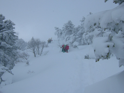 ![]() ラッセルが大変な登り ![]() 誰も歩かない新雪を行く ごんちゃん ![]() 山頂のごんちゃん 途中合流したボーダーと仙台の山家さん ![]() 山頂のエビの尻尾 SEI寒いです ![]() ゲレンデTOPに下山 ![]() ![]() ![]() ![]() ツェルトにて休憩(鍋焼きうどん&ホットワイン) 後烏帽子岳に入るため 烏帽子スキー場に着くがスキー場のリフトが未だ動いていない あと20分位で全てのリフトが動くとアナウンスされる リフトを2本乗りゲレンデTOPに着いた AM9:30分 準備をして誰も歩いていない雪原を歩くラッセルの深さは50cm位 雪がサラサラで歩きやすく助かる 歩き始めて1時間くらいしたときに地元の山家さん3名とボーダー2名と合流しラッセルを交代しながら進む 太陽は殆どでない!風が弱いため雪は舞い上がらない視界は数十mありそれなりの景色を楽しむことが出来た 登り2時間30分弱のコースタイム 雪の量からするとまあまあのタイムか なんだか解らないが一人よがりとも取れる 山頂は風が強く長居は無用だ 指の先が痛い シールを外し下山の準備 帰るべよ〜と下る パフパフの雪を胸まで抱きスキーが気持ちよく走る 今年の最高の雪質だ〜気持ち良い〜ホーホー!! 写真が無いのが残念だ(ごんちゃん転倒のため写真撮れず・・・・(>_<) ) ゲレンデまで下りてツリーの陰でランチタイム 鍋焼きうどん&ホットワインで今日の行程を〆切ました。 仙台の山家さん・若者のボーダーさん・ごんちゃん有り難うございました ・・・・SEI・・・・ 戻 る |