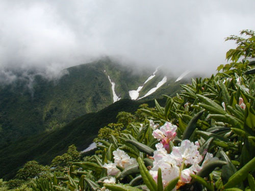ハクサンシャクナゲ越しに大朝日岳方面を望む
