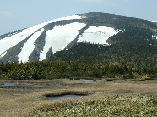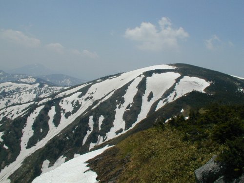 解説要らないですね。(野球の広岡さんみたい!懐かしい) 池の岳付近からの頂上。 池の岳手前の急坂から振り返ったアングル。 台倉山付近の稜線からのコブシ越しに見る燧ヶ岳。
