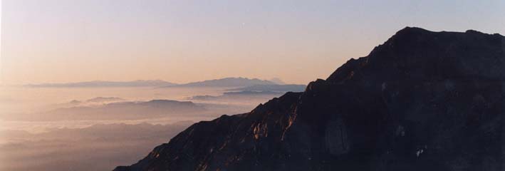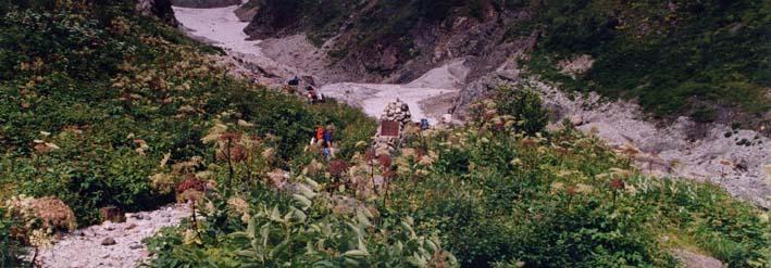 大雪渓への道 新井(後方) 遠藤(先方)の両先輩を 霊峰富士山と八ヶ岳連峰 昨日の初冠雪も本日晴天の前触れ写真の下手さをカバーする上天気である