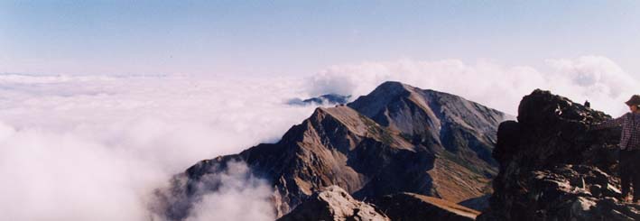 小蓮華岳 見慣れた南東風景よりと思い雲間にヒョッコリその姿はどうだ?・・小蓮華 杓子・白馬槍 サングラスの女性は20代?東北の山々と違い若い女性が多いのが嬉しい